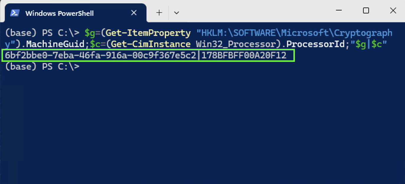 $g=(Get-ItemProperty "HKLM:\SOFTWARE\Microsoft\Cryptography").MachineGuid;$c=(Get-CimInstance Win32_Processor).ProcessorId;"$g|$c"